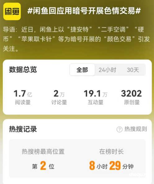 闲鱼针对此类事件给出答复:“对于类似情况,可上传截图和聊天记录举报,如情况属实会封号。”随着数十家媒体进行了报道,#闲鱼回应用暗号开展色情交易#冲上了热搜。