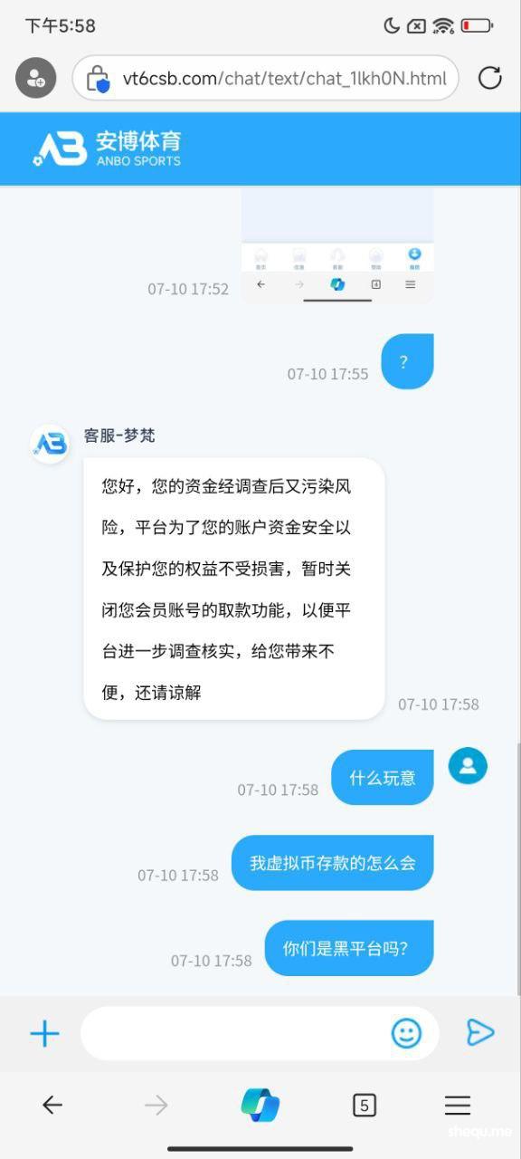 安博体育是个黑台子,不知道从哪弄得我电话号码,给我打电话说体育有包赔活动,我就冲了3万,打了差不多5万流水,提款给我拒绝,想着少提一点试试,结果提1000块都不给出,死妈玩意,这是我给朋友代买球的钱,现在身边的朋友都在找我赔付,台子不给我出款,说我账号有污染风险?头一次听到这么荒唐的理由,污染风险?我听到这个理由我是又想哭,又想笑,后来我试探的问了一下,怎么合作?他们直接不装了,拉人返佣,这不就证实了,妥妥的黑台子么,杀人不见血,吃人不吐骨头,现在的网赌还有真实的吗?大家一定要擦亮自己的眼睛,不要被这种黑台子给当猪杀,黑台网址 https://m.anbo86.com 我现在都觉得我猪都不如,狗都不如,我好后悔,好后悔接触了网赌,我真的不知道该怎么办了,这件事没完,安博平台管理,看到请联系我处理,明天12点之前不联系我处理,我直接报警,我豁出去了,要死一起死,你断了我活命的唯一希望,我也不会让你们好过